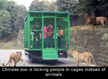 In order to change this, one Chinese zoo is giving its visitors the chance of a lifetime to realize what it would be like for them if somebody trapped them in a cage while tons of strange creatures wander around them. The Lehe Ledu Wildlife Zoo located in Chongqing, China, launched a new kind of visitor policy in December 2014. The visitors are locked in a cage, which is attached to the back of a truck that drives around the zoo. The wild animals, such as lions and tigers, are wander freely around the zoo and often leap onto the trucks, since the zookeepers intentionally strap pieces of raw meat to the vehicles.